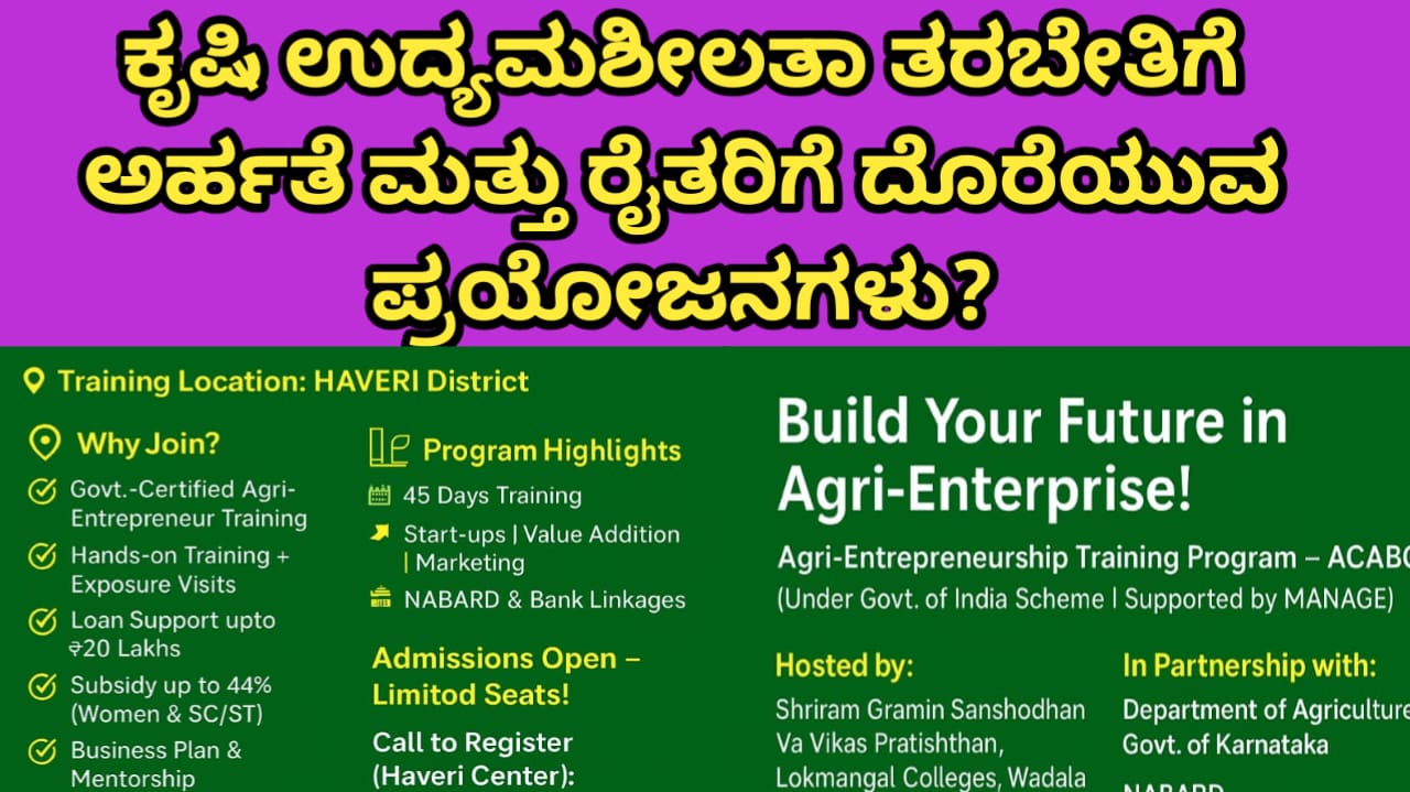ಹಾವೇರಿ ಜಿಲ್ಲೆಯ ಕೃಷಿ ಉದ್ಯಮಶೀಲತಾ ತರಬೇತಿ ಕಾರ್ಯಕ್ರಮ (Agri-Entrepreneurship Training Program – ACABC) ಪರಿಚಯಹಾವೇರಿ ಜಿಲ್ಲೆ ಕರ್ನಾಟಕದ ಮಧ್ಯ ಭಾಗದಲ್ಲಿದ್ದು, ಕೃಷಿಯು ಇಲ್ಲಿನ ಜನಜೀವನದ ಮೂಲಾಧಾರವಾಗಿದೆ. ಬಹುಪಾಲು ಜನರು ಕೃಷಿ, ಪಶುಪಾಲನೆ, ತೋಟಗಾರಿಕೆ ಹಾಗೂ ಇತರ ಕೃಷಿ ಸಂಬಂಧಿತ ವೃತ್ತಿಗಳಲ್ಲಿ ತೊಡಗಿಕೊಂಡಿದ್ದಾರೆ. ಈ ಹಿನ್ನೆಲೆಯಲ್ಲಿ ಯುವಕರಲ್ಲಿ ಸ್ವಯಂ ಉದ್ಯೋಗದ ಮನೋಭಾವ ಬೆಳೆಸಲು ಹಾಗೂ ಕೃಷಿಯ ನವೀನ ತಂತ್ರಜ್ಞಾನಗಳನ್ನು ಅಳವಡಿಸಲು Agri-Clinics and Agri-Business Centres (ACABC) ಯೋಜನೆ ಅತ್ಯಂತ ಮಹತ್ವದ್ದಾಗಿದೆ. ಈ ಯೋಜನೆ ಕೃಷಿ ವಿಸ್ತಾರ … Read more