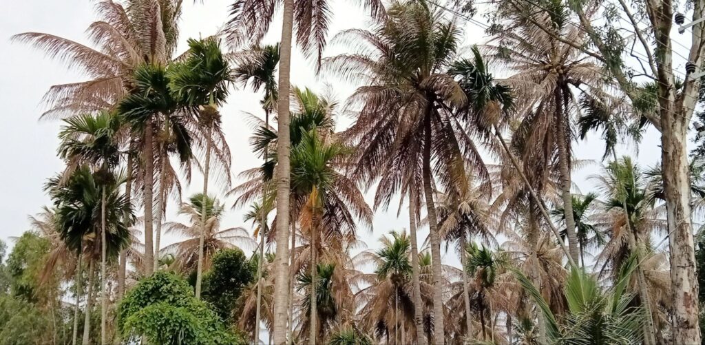 ಚಿತ್ರದಲ್ಲಿ ತೆಂಗಿನ ಮರಗಳಲ್ಲಿ ಕಾಣಿಸುತ್ತಿರುವ ತೀವ್ರ ಹಾನಿ ಮತ್ತು ಮರುಗುಳಿಕೆಯ ಲಕ್ಷಣಗಳು ಗಮನ ಸೆಳೆಯುತ್ತವೆ. ಹಲವಾರು ಮರಗಳ ಎಲೆಗಳು ಒಣಗಿ ಕೆಳಕ್ಕೆ ಜೋತುಬಿದ್ದಿದ್ದು, ಕೆಲವು ಮರಗಳ ಕಾಂಡದಲ್ಲಿ ಗಾಯದ ಗುರುತುಗಳು ಹಾಗೂ ಬಿರುಕುಗಳು ಕಂಡುಬರುತ್ತಿವೆ. ಇದು ಕೇವಲ ಒಂದು ಮರದ ಸಮಸ್ಯೆಯಲ್ಲ; ತೋಟದ ಒಟ್ಟಾರೆ ಆರೋಗ್ಯದ ಮೇಲೆ ಪರಿಣಾಮ ಬೀರುವ ಗಂಭೀರ ಪರಿಸ್ಥಿತಿಯ ಸೂಚನೆ. ತೆಂಗು ಬೆಳೆಗಾರರಿಗೆ ಇಂತಹ ಲಕ್ಷಣಗಳು ಕಂಡುಬಂದಾಗ ತಕ್ಷಣವೇ ಕಾರಣವನ್ನು ಗುರುತಿಸಿ ಕ್ರಮ ಕೈಗೊಳ್ಳುವುದು ಅತ್ಯಂತ ಅಗತ್ಯ. ಸಮಯಕ್ಕೆ ಸರಿಯಾಗಿ ಗಮನಿಸದಿದ್ದರೆ ಉತ್ಪಾದನೆ ಕುಸಿಯುವುದು, ಮರಗಳು ದುರ್ಬಲವಾಗುವುದು, ಮತ್ತು ಸಂಪೂರ್ಣ ತೋಟದ ಆರ್ಥಿಕ ನಷ್ಟ ಹೆಚ್ಚುವುದು ಸಹಜ. ಈ ದೃಶ್ಯವು ಸಸ್ಯರೋಗ, ಕೀಟದ ದಾಳಿ, ಪೋಷಕಾಂಶ ಕೊರತೆ, ಅಥವಾ ನೀರಿನ ನಿರ್ವಹಣೆಯ ಸಮಸ್ಯೆಗಳಿಂದ ಉಂಟಾಗಿರಬಹುದೆಂಬ ಸಾಧ್ಯತೆಯನ್ನು ಸೂಚಿಸುತ್ತದೆ.